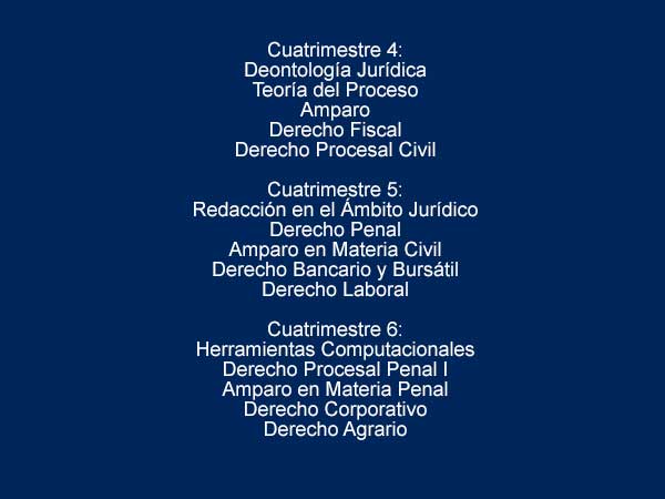 Formar abogados que interpreten y apliquen las competencias y las normas jurídicas, basadas en los principios teóricos y metodológicos vigentes del derecho. Así como fundamentar los valores de justicia, igualdad, seguridad, orden y el bien común; ejecutando los conocimientos y habilidades en la resolución de problemas de acuerdo a las necesidades actuales de nuestra sociedad.